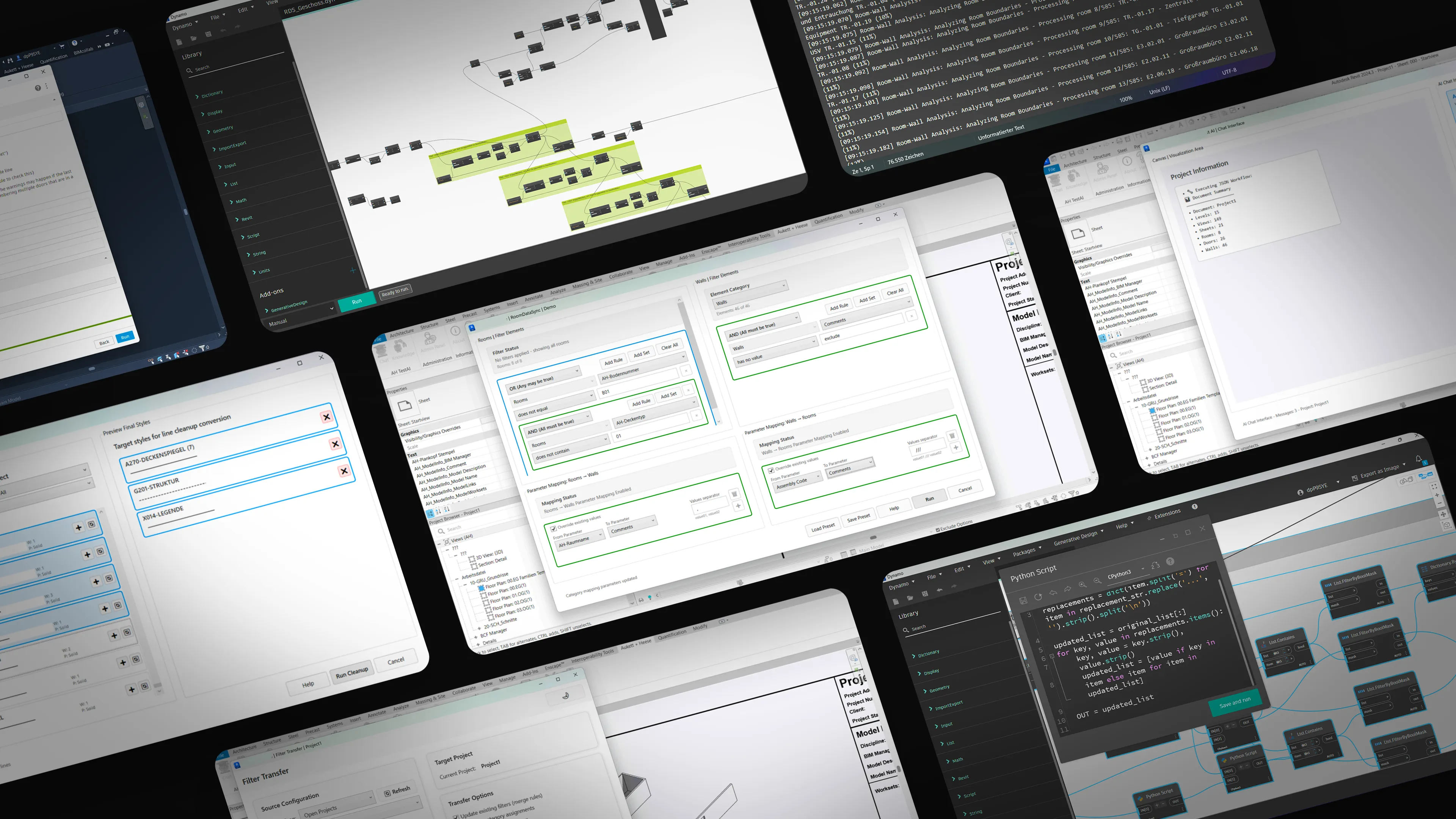 The library covers the repetitive, time-consuming parts of BIM work: managing parameters, controlling filters, numbering elements, generating geometry from external data, and keeping project files clean.